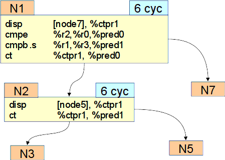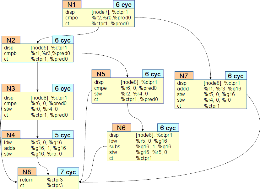 Как видим, оба фактора отрицательно сказываются на производительности при исполнении этого кода. Перед компонентой компилятора, занимающейся планированием кода, стоит задача обнаружить и выразить в широких командах параллельность на уровне операций в пределах линейных участков кода, и одновременно с этим при размещении очередной операции в широкой команде выдержать длительности операций-предшественников, которые вырабатывают ее аргументы.